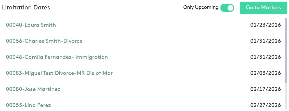 Never Miss Critical Deadlines with an Always-Visible List of Upcoming Limitation Dates per Matter.